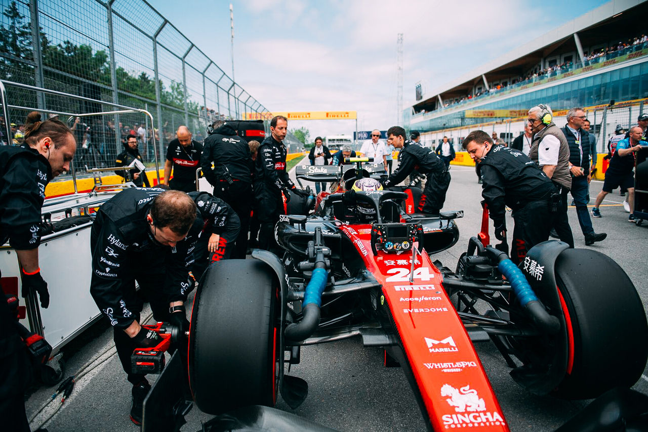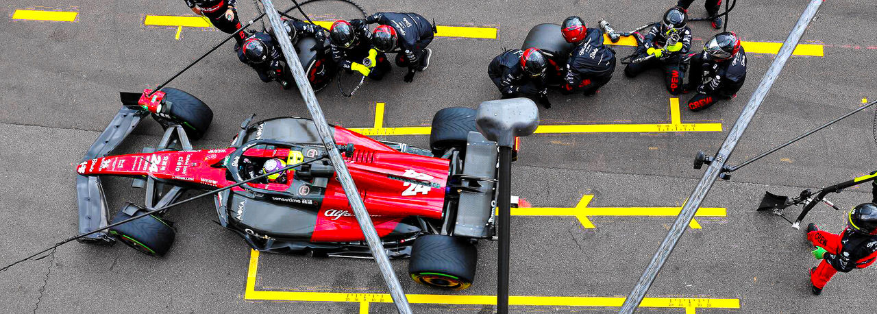 The Alfa Romeo F1 Team Stake C43 F1 car hurtles into the pits, the driver bringing it to a perfect stop within the ‘box’. The millisecond it comes to a halt, 22 team members spring into action, swapping all four tyres, adjusting aero settings and sending the car back on its way in under three seconds.